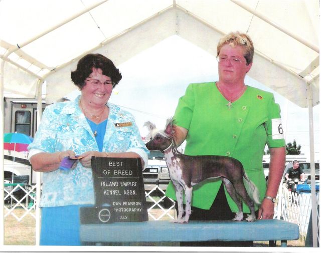 | Bare-E being shown here for the first of her majors by Lynn Knapp. Bare-E is a true hairless with flawless movement, a level topline and a wondeful attitude for showing. Bare-E is now being shown by me....for I finally have the experiance to show her. |