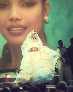 Notice how Julie and Ali both picked, Spain, Philippines, and VENEZUELA as their top 3 but Spain won that portion with Botswana in 2nd and Philippines in 3rd. Carolina probably could have taken the crown seeing how this was a no-win situation and I'll get to that in a second. Notice how Miss Philippines was called in the middle? This was a sign that they wanted her to win because all the recent winners have been called in the middle. The final question was a turning point. They were asked if Miss Universe should continue her reign if she was to get pregnant. I know this question was indirectly related to the disqualification of Miss Guam, Trisha Heflin, after it was discovered that she was pregnant. All three surprisingly said yes but Botswana gave the best delivery OF THE 3. Had Venezuela or India made the top 3, I think the situation would have been different. Miss Spain didn't really finish her answer. Miss Philippines seemed to lack a little confidence and composure. She said Miss Universe should continue if she has been a good example and set goals but a pregnant Miss Universe obviously hasn't been a good example and this pregnancy could not have been intentional had it occurred during her reign since it was not planned. This is why Julie and Ali said she choked. Miss Botswana answered well but she thinks that a baby would not affect her reign and that it is an expression of her femininity (or feminity, as Mpule would say) but since Mpule answered the best, she won. Notice also how she quieted down the audience in saying, "thank you" showed that she was very in control. Of the 3, Botswana had the most confidence. Mpule also gave quite a reaction to winning the crown! Wendy looked sensational in this gown as she did her farewell walk to her song "Kiss of Life". The hair looked somewhat plastic but she was still a true Miss Universe.