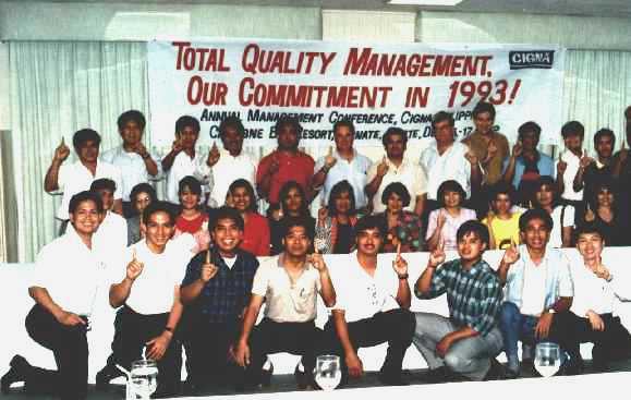 Group picture of participants to the yearend training conference on Total Quality Management, with Kevin McCarthy (5th fr. R), SVP of CIGNA-Worldwide's Southeast Asia Regional Office, and Stewart Steffi (6th fr. L), SVP for the Pacific Area as guests of honor.