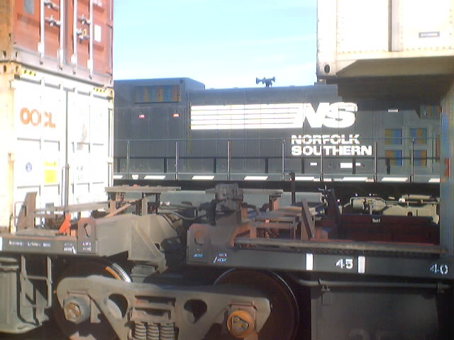 My camara goofed up on me and all i got was this half shot of a Norfolk and southern on a consist of BNSF locos leaving the Needles, Ca yard