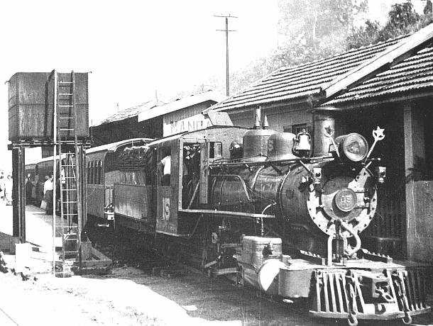 Locomotiva nrº 15 do Tramway da Cantareira, uma Alco 2-6-0 construída em 1920, quando abastecia-se de água junto à estação do Mandaqui, com uma composição de diversos carros de madeira. Foto Carlheinz Hahmann, 1956. Acervo Tony Belviso (BSA-I)