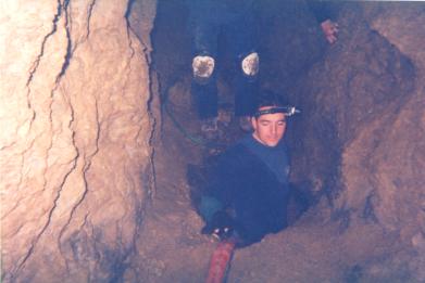 At the end of one of the tunnels was a shaft in the center of the floor that dropped down only about 5 feet, then a tunnel ran both directions from there. But this shaft and tunnel was filled up with water with only about 2 inches of clearance from the water to the ceiling. We could hear water dripping down from inside the tunnel and it sounded like it was dripping down from a long ways. We figured that possibly this was a water trap and that there might be a room on the other side where the Navajo's hid there treasure.
