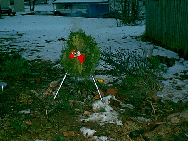 This is one of the wreathes we burned, notice the flame in the middle of it. The time from start to end of this burning was easily under a minute, these burn very fast as do the trees.