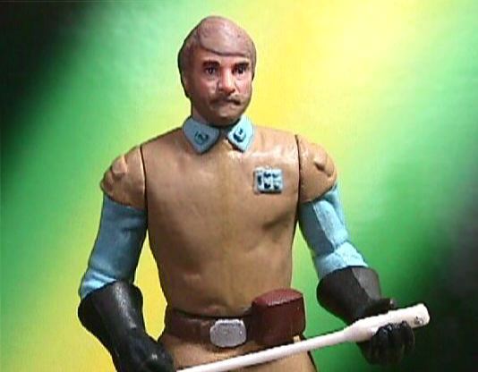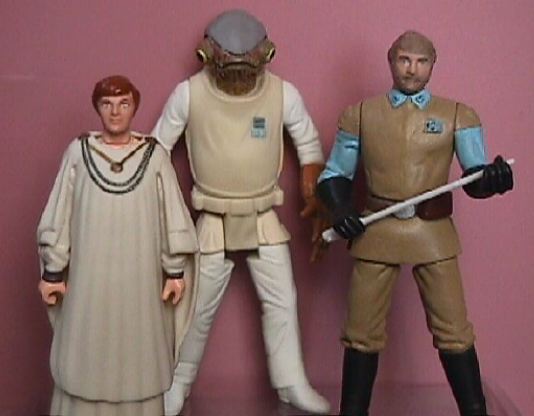 | Here you see Madine posed with Hasbro's Mon Mothma (who sacrificed her baton for my custom Madine) and Admiral Ackbar figures. I had just begun sculpting a helmet on Ackbar's head, planning on repainting the figure to make a different Mon Calamari character, when I learned that Hasbro would be releasing their own Mon Calamari Officer figure. | ||||||||||||