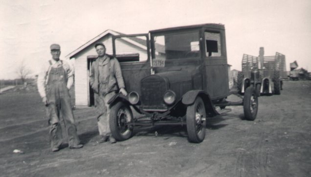 Photo of granddad's Model T. This was the forerunner to the convertible but the floor was missing instead of the top. It had a hole in the floorboard and you could see the ground passing under you rather rapidly when riding in it. Grandad is on viewer's left in the photograph and Jerry Davis his nephew is closest to the Model T in the photo. Jerry told me that it wasn't him in the photo last time I saw him, I think mom had told me it was Jerry when I first got the photo.