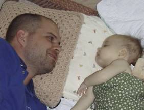 5/15/06: Geoffrey was tearing apart his bookshelf, and complaining today. I wondered what book he wanted so bad. It was a little Golden book version of "David and Goliath." I was struck by the similarity between Geoffrey's life battle, and David's triumph over Goliath. Geoffrey, so little, defeating this scary thing that grown men are loath to take on. He's won by just doing what is natural to him, like David. He's resting so sweetly now and I can't help feeling like the luckiest mom ever.