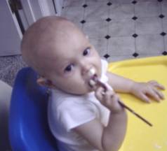 05/02/06: Geoff loves going outside, and Eliza loves being able to let him make whatever mess he likes out there. On Sunday he licked a mixing spoon clean as you can see. Monday he destroyed a dinner roll, it was awesome. Nothing exciting has happened with his treatment, Hurray! We're watching his eyes and other systems just in case. Another baby developed jaundice from the chemo at this stage. We just have 2 weeks and 1 day left of chemo, for those of you who like us, are keeping track.