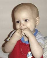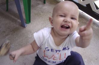 3/27/06: Geoff if doing some really neat signing babble. When we sing/sign the alphabet, he scrunches his fingers into various possitions, including "n" "o" and a lot of almost letters. Just 2 months of chemo to go!