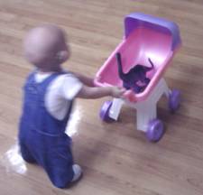 04/30/06: Another delightful day with Geoffrey. Phillip set up this barrier on the back porch so Geoff can wander outside safely. It's so nice to see him up and active. He ate a lot of food today including pasta, peanutbutter, crackers and milk. Tonight he "said" light and ceiling fan appropriately. He also helped Eliza sweep the porch.