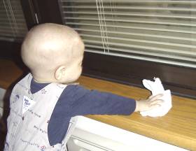 3/08/06: I've gotten use to the fan. The BMT wing is less busy, thankfully, but with the fan running I don't hear any of the things going on in the hall. The door has a time delay close, so I hear the click, minutes after someone has left. Geoff has a bit of a runny nose, and fussiness, but no more fevers and so far, no positive cultures. If nothing grows in the next 12 hours we can go home! I don't know if we'll be on home anti-biotics or not. Probably, but we've never had the no + cultures after fever scenario before. Today I was wiping off the window sill where Geoff likes to play. When I was done, he picked up the towel and started to rub the sill some more. Grandma Colleen has taught Geoff how to sanitize his hands. It's so cute to see him rub his little hands together!