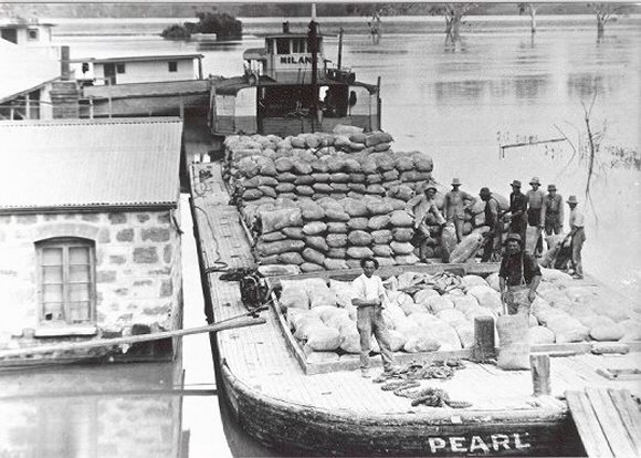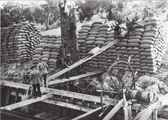 Loading bagged wheat into a barge at Wongulla landing, on the River Murray, South Australia |