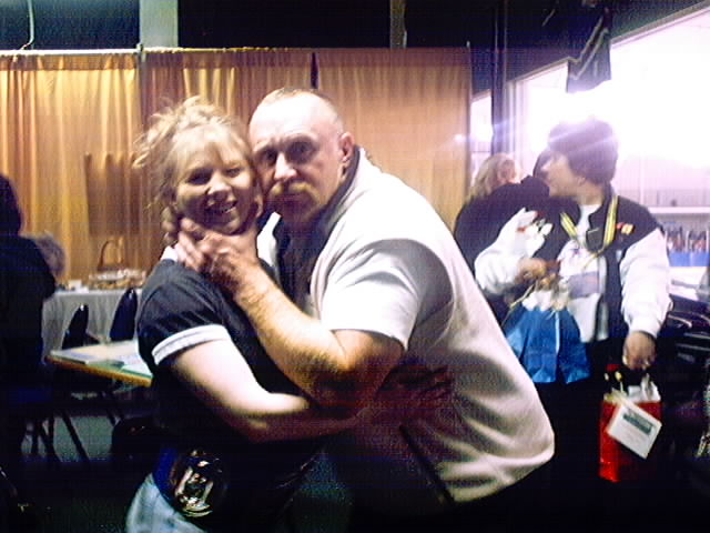 | Me and my Really Big Friend and true gentalman Mr. Outragous at the Special Olympics 2001 Games. He was here to sponser the Floor Hockey compition but made plenty of time for the Ice skating champs! One hell of a guy and sadley missed here in Alaska. If you look close you will see his Chamionship belt around my waist. |