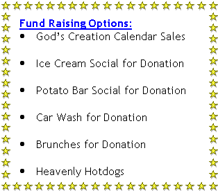 God's Creation Calendar Sales: The calendars are in and the sales have begun. The calendars cost $6.00 each. This year's goal is to sale 300 calendars which will help us hit a $$ target of $900. Calendars are available from any SYGGY member , by web-calendar order form, or will be on sale during the 9:30 am coffee hour through December 15, 2001.