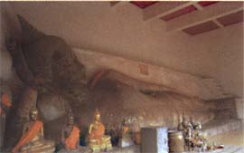 มีพระพุทธรูปประทับนอนหงาย มีลักษณะคล้ายพระนอนที่เมืองกุสินารา ประเทศอินเดีย