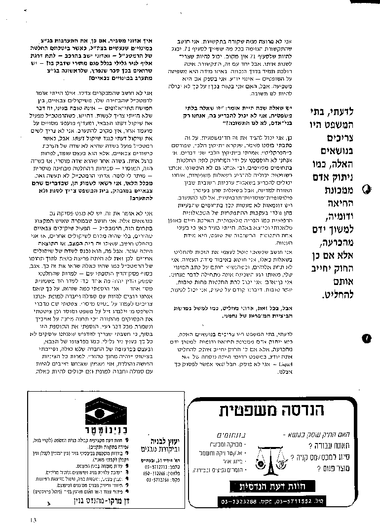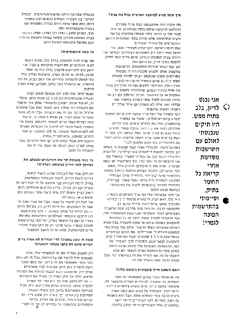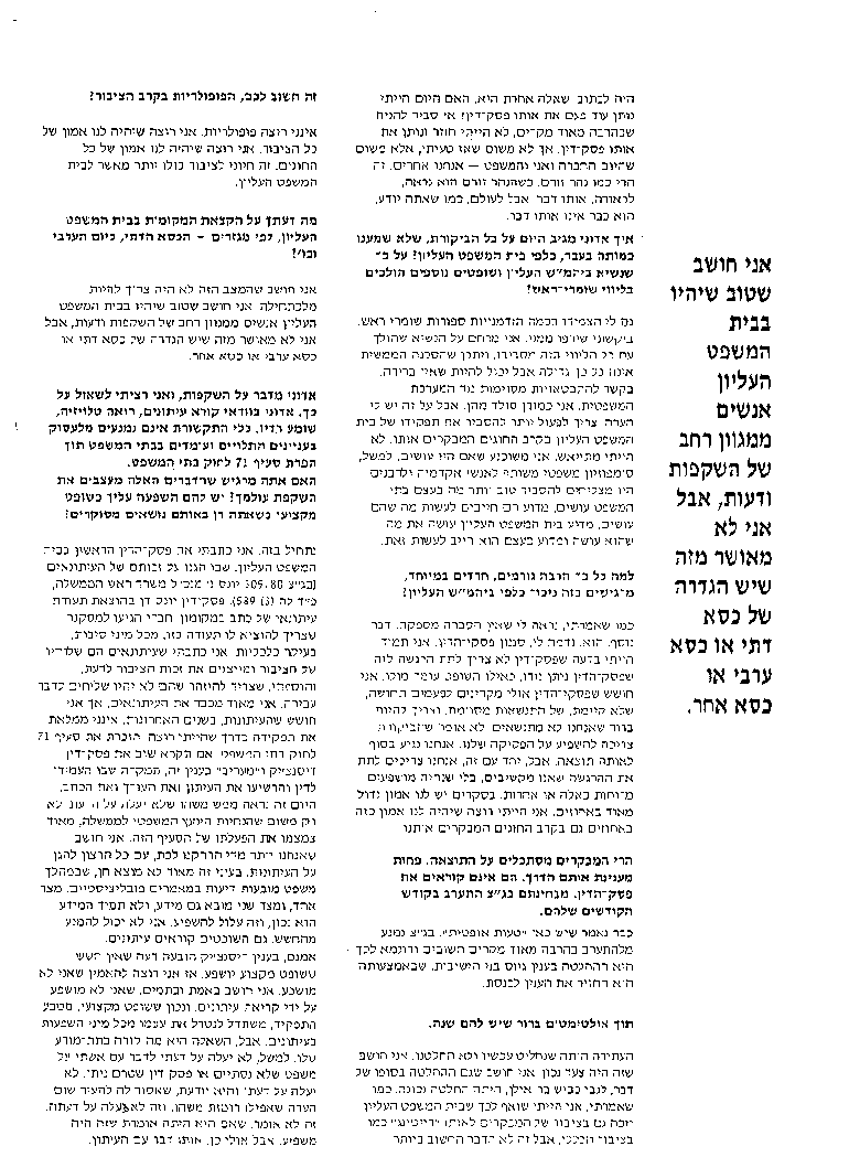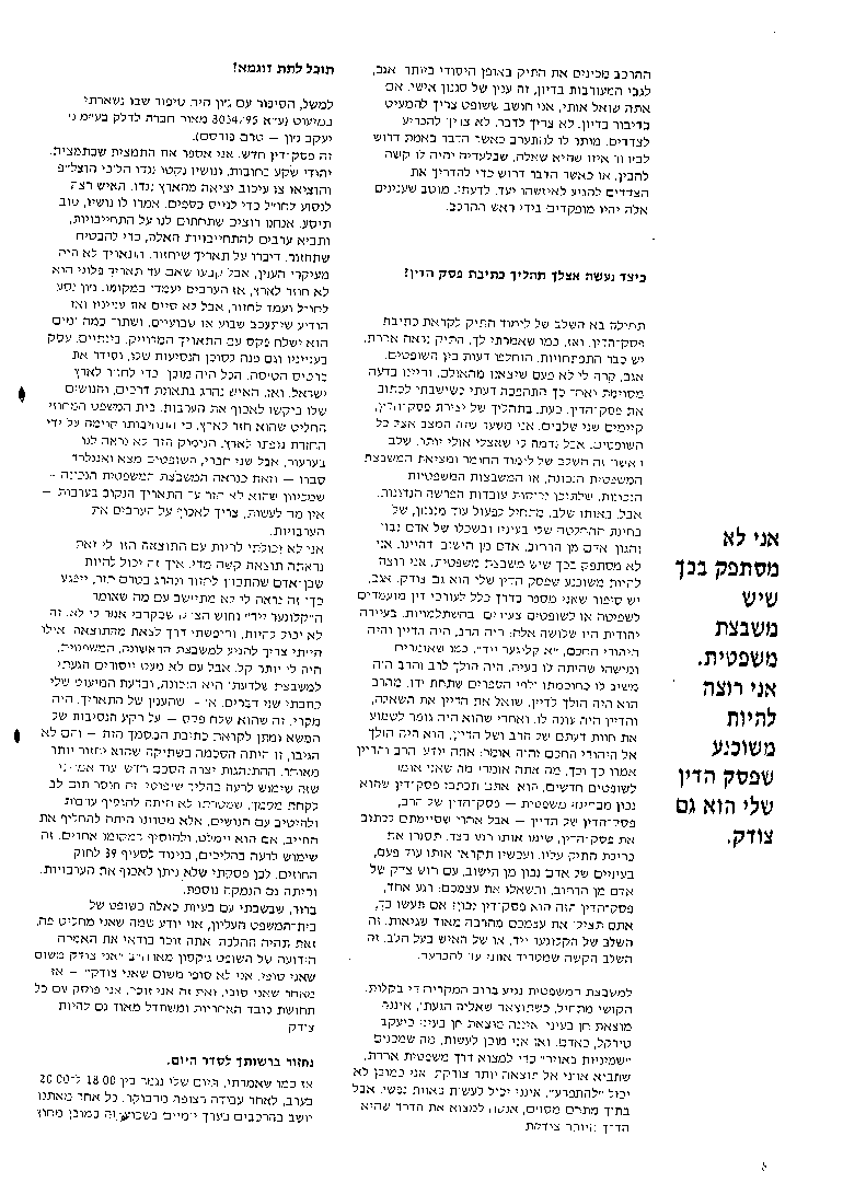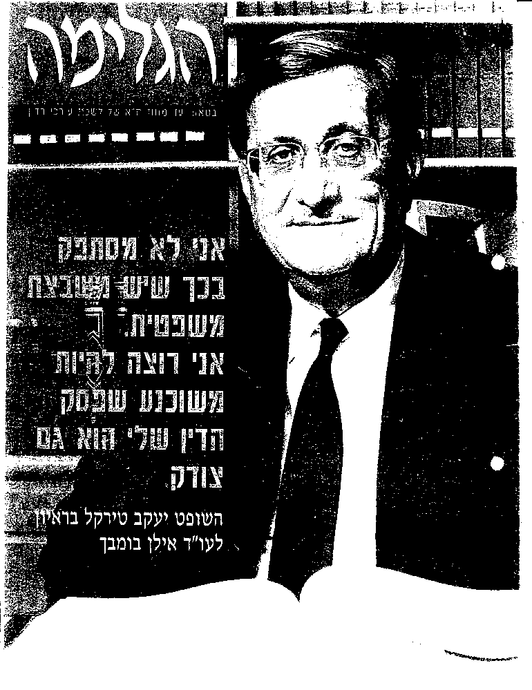 His parents made aliya (1933) from Vienna. His family branch is Israel-Menachem Alter Turk'l. Recently, Justice Yaacov Tirkel gave an interview to the lawyer Ilan Bombach, who wrote a Hebrew article in the Tel-Aviv Bar Bulletin, "Haglima". Herein you may view all its 9 pages. each page will open a separate window, (GIF file w/o a further link). |