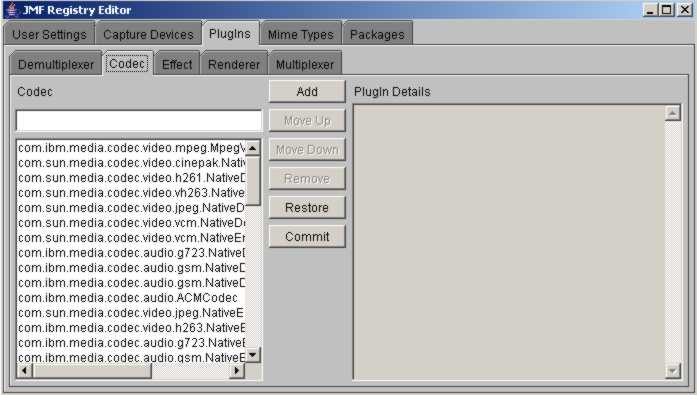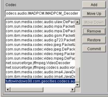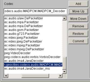 Quando deve riprodurre una sequenza di dati multimediali,JM STUDIO legge dalla lista dei codec in ordine e seleziona il primo codec adatto che trova. JMS dispone già di un decoder ADPCM registrato come com.ibm.media.codec.audio.ima4.JavaDecoder _ms,perciò dobbiamo fare in modo che il nostro compaia in lista prima di questo,cliccando su Move Up e poi di nuovo su Commit.