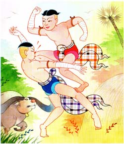 ยกเท้าขึ้นเหยียบบริเวณต้นขาข้าง ที่คู่ต่อสู้กำลังจะยกเตะมา พร้อมถีบตัว พุ่งเข่าอีกข้างกระแทกคาง หรือยอดอกคู่ต่อสู้