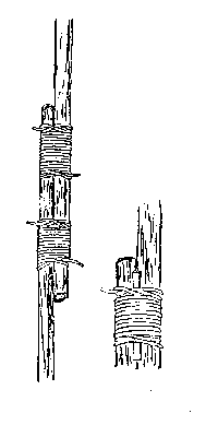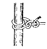 | 用來紮三腳架之用. 將三支棍平放在一起, 在最外的其中一邊以雙套結開頭, 然後將繩以”梅花間竹”形式在三支棍間向上繞圈. 按繩的長度, 在6-9次後, 在兩支棍中間再繞圈兩次收緊. 最後在開始的另外一邊以雙套結收尾. |