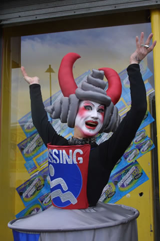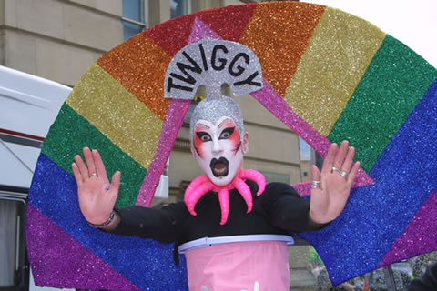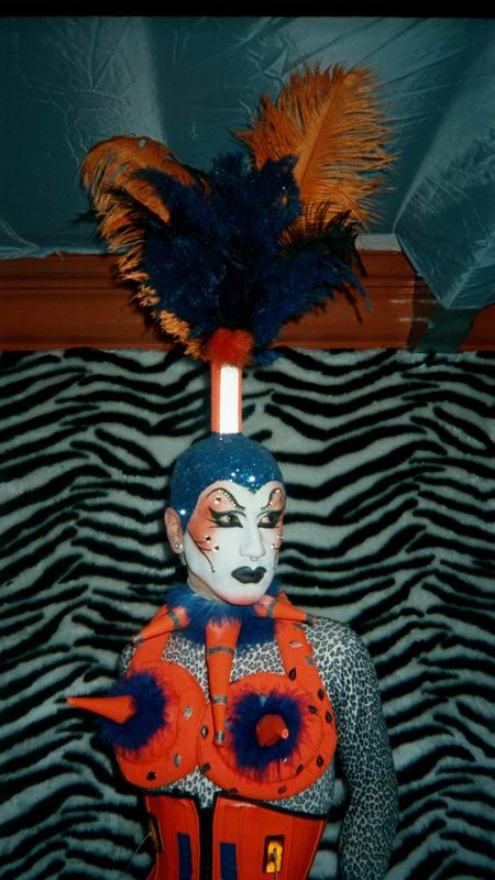 "Twiggy Twisted has worked in clubs since the early 80's. He is recognised as one of the worlds most sparkling night-time creatures adding a twist to any event..... He has appeared in print,( in almost every music/fashion/gay publication), many hundreds of times as well as in exhibitions and several times on film,( large and small screen), including a two year feature on his life for the B.B.C. His outlandish costumes and ability in interact with everyone make him popular at any venue regardless of geography or language. He has travelled all over the world, (Dubai, Singapore, Ibiza, Israel, Cyprus, Yugoslavia, etc), bringing smiles and quizzical looks to every face. His"bizzare beauty", "Dali-esque-disposition" and "grave glamour" will entice and envelop anyone with a perchant for uniqueness. He can provide one of his own stunning ensembles or create something to, ( more or less), cater to your specifications; which will always be about 7 feet high.