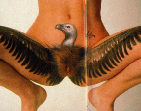 (*spread eagle* to the right and modeling a chastity belt in the background).