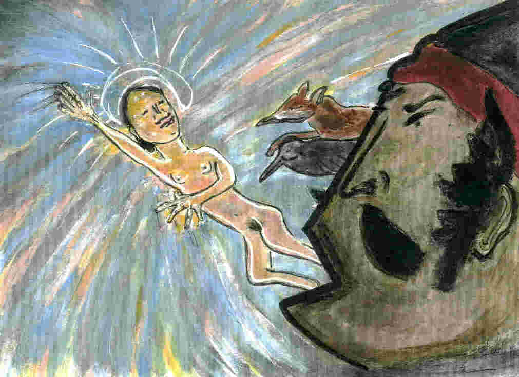 Once she was the Moon but this modest girl was so embarrased by what she saw at night that she asked to change places with the Sun. Every night she is swallowd by a Giant and every dawn she escapes with help from fox and raven, the sacred animals. back home next page |
