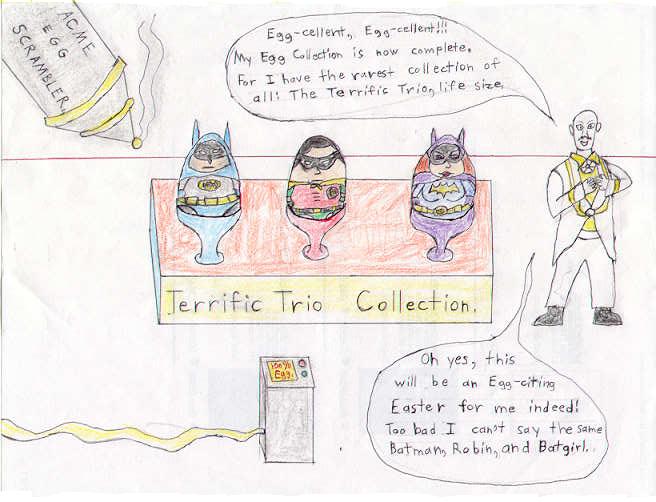 To celebrate his favourite holiday, Egghead decided he wasn't going to rely on the Easter Bunny for Easter eggs. Instead, he managed to capture the Terrific Trio, and using his ACME Egg Scrambler, turned them into life-size eggs!