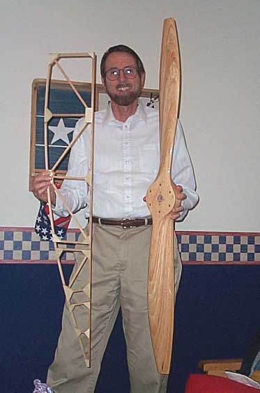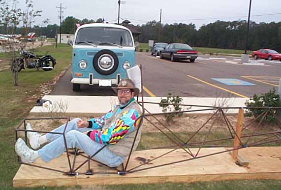 | It was October 2000 when I bought a Legal Eagle project that was already started. Here it is, still attached to the building board. The dream of building and flying my own airplane was one step closer to coming true. (That's "Das Bus", my 1971 VW in the background.) The project had a partially tack welded fuselage, all 24 ribs, spruce spar material, partially built tail feathers, a pile of VW engine parts, prop hub a and new propeller. (And a partridge in a pear tree.) |