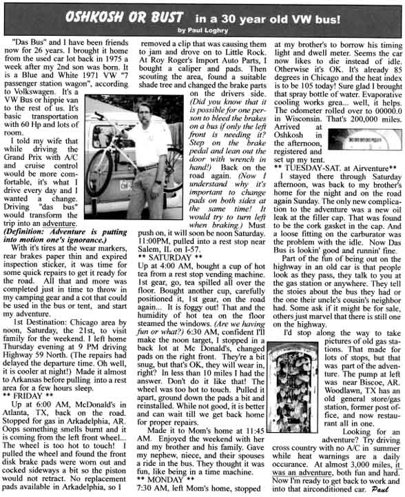 This is the story (as it appeared in our EAA Chapter 302 newsletter) of my "adventure" driving to Oshkosh this summer from Houston, TX in the middle of a heat wave across the country.