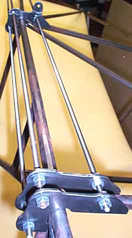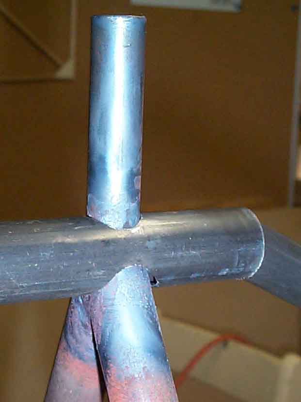 | Being left to my own imagination regarding the junction of all the tubes overhead, this is what I came up with for the rear wing mount. Yes, that is a 3/4" tube overhead, but certianly didn't need to be. The vertical is 1/2" and a 5/8" will be slipped over it after it is welded. Then a couple rosette welds... yes I added weight. |
