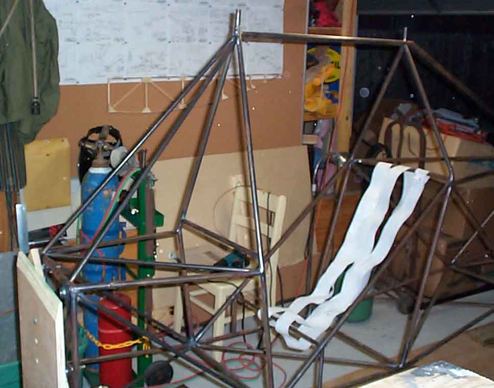 | Fuselage is mounted in a "rotisserie" for ease of welding. Shure helps avoid standing on your head to weld. The lawn chair webbing was my first seat, just to get a feel for what it would be like. I plan to add a horizontal tube to the station 3 verticals. The seat will go behind that tube and form a fixed seat rather than a sling. That will give me a lot more leg room. To test it, I just slid a tube over the seat and behind station 3 and sat down. It works. |