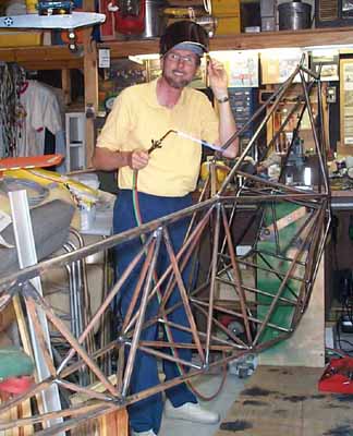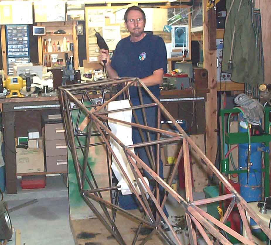 | At left is is a posed picture. I do wear gloves and some protective clothing when welding. That is a full face shield that's tilted up with my left hand. This is the way my LEU looked all summer (2001) while I was distracted with many other summertime activities such as Oshkosh, vacations, and work. Besides, it was too hot to work in the garage. The finish welding is done with the exception of the fittings for the wings/gear and the tail post plate for the tail wheel spring attachment... and the rudder pedal tabs, and windshield and floor board tabs... sounds like I've got a way to go yet. |