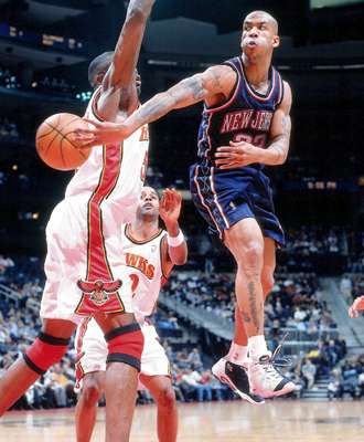 Stephon Marbury passes behind Mutombo's back
