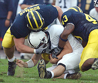 The No. 13-ranked University of Michigan football team improved to 5-1 and 2-0 in the Big Ten Conference with a 27-24 overtime victory over No. 15 Penn State on Saturday (Oct. 12) in front of the fifth-largest crowd in Michigan Stadium history. Junior running back Chris Perry gave the Wolverines their second overtime win in as many attempts with his three-yard touchdown rush to cap off Michigan's overtime possession. Below: A Zack Sack