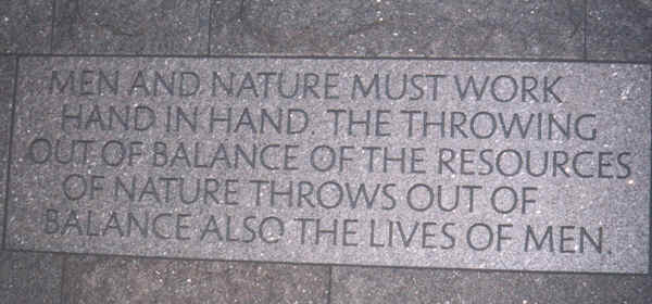 A country motto, emblazoned in stone: "Men and nature must work hand in hand. The throwing out of balance of the resources of nature throws out of balance also the lives of men."