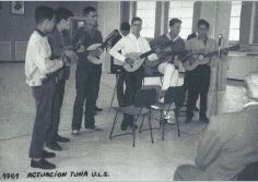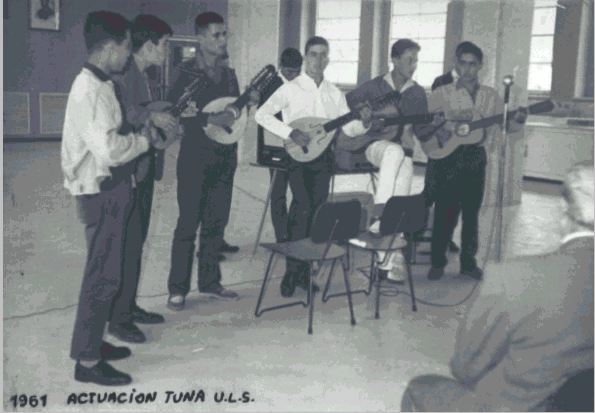 Ensayando la tuna de la U.L.S en un comedor. En el medio y con camisa