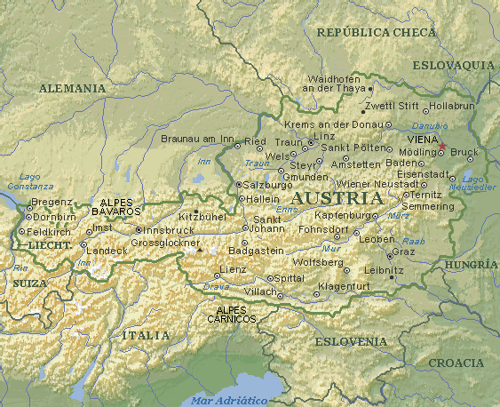 Superficie: 83.859 km² Sistema político: Democracia parlamentaria federal Economía: Capitalista mixta Población: 8.100.000 Capital: Viena (1.600.000) Otras ciudades: Graz (244.000); Linz (202.855); Salzburgo (143.978); Innsbruck (118.000); Klagenfurt (87.000) |