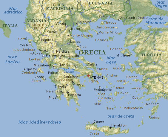 Superficie: 131.957 km² Sistema político: Democracia parlamentaria Economía: Capitalista mixta Población: 10.500.000 Capital: Atenas (3.096.775) Otras ciudades: Salónica (377.951); El Pireo (196.389); Patras (154.596); Heraklion(Candia)(117.167); Larisa (113.426); Vólos (52.000) |