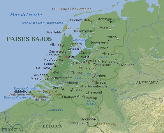 Superficie: 41.526 km² Sistema político: Democracia parlamentaria Economía: Capitalista mixta Población: 15.700.000 Capital: Amsterdam (724.096) Otras ciudades: Rotterdam (598.521); La Haya (454.000); Utrecht (234.170); Eindhoven (195.000); Groninga (170.038) |