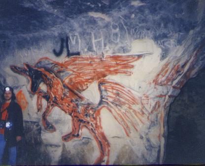 | This old brewery cave, excavated in the St Peter Sandstone at least as early as the 1890s, was the greatest "party cave" under St. Paul, Minnesota, for many years. The Banholzer Brewery itself no longer exists. During one bust, cops stood at one entrance, shot off tear gas, and stationed others at the exit to arrest the wild partiers. The cave could be entered through a small building on the north side of Shepard Road, or through a sewer tunnel on the river bluffs (now replaced by a small diameter pipe). The cave was slurried full of sand in 1991 during the widening of Shepard Road. Famous features of this cave included the so-called "Pegasus" mural--an enormous winged horse in red spray paint, "Tolkien Tunnel," beloved of Hobbit fans, a giant skull with a punk rock hairdo, and of course that vulviform erosional modification of a vertical joint in the stone that I won't mention by name. My own personal recollections of this great cave include standing under Shepard Road and hearing the rumble of traffic overhead, which shook loose a perpetual rainfall of sand grains, and having a desperate paint-sniffer stalk me from room to room through the abandoned galleries late at night. Pretty spooky! |