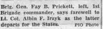 1st Brigade - Lt. Col. Albin F. Irzyk left the 1st Brigade on August 28. He is returning to the United States and after a Short leave he will report to The Armored School at Fort Knox, Ky., for duty.