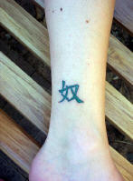 norti's latest tattoo.... the chinese symbol for "slave". The symbol itself is called "Nu" which means property of a person or household.
