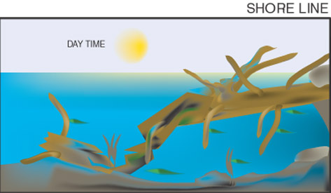 This exsample is what it mite look like under that fallen tree. Plenty of branches to hide. Fry grow up here, hence adults feed here also.Some fish are a funny sort, like Bass. They will hide one eye behind a blade of grass, thinking that it is toatale hidden The shade keeps the water cool in the hot sunny days. so more fishing for both you and them. |