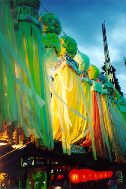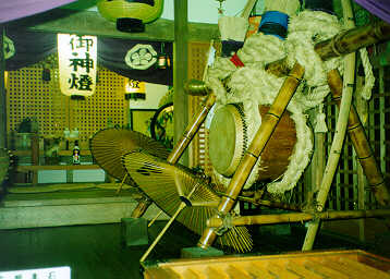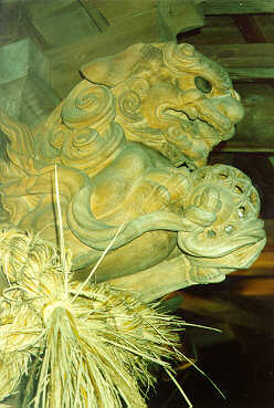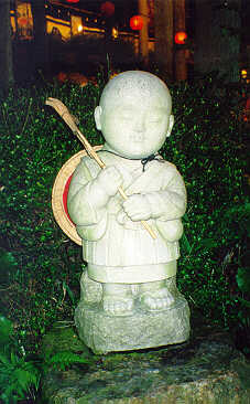 | There is a Shinto shrine at the Chicken Shack; the shrine dogs are carved into the roof beams! Very impressive! | The Chicken Shack was brightly decorated in August (for the Bon Festival?) | You find these little statues of gods all over Japan... there's one here, too :-) |