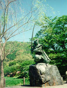 LEFT: Statue of Kojiro-Sasaki in Kikko Park; This statue is based on a character in a novel "MUSASHI MIYAMOTO", written by Eiji-Yoshikawa. The Iwakuni Castle is visible on the skyline to the left of the sword. (May '97) | ![]() |