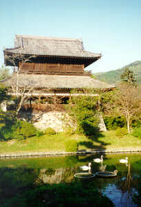 | RIGHT: Kinun-Kaku in Kikko Park; This was constructed in 1885, and modeled after the south turret which was formerly located here. There are swans (and ducks) swimming in the moat below. (Oct. '97) |