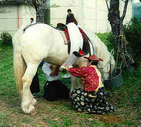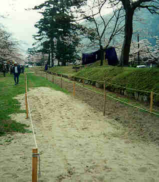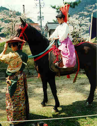 Mochi is a traditional rice dish eaten for New Years celebrations (often in ozoni soup). It is traditionally made by pounding the rice with a mortar and pestle, but these days it is apparently unusual to see it pounded by hand, rather than by machines. Probably akin to watching someone milk a cow, or churn butter by hand, in the states! We enjoyed the demonstration even more, knowing it was getting to be a fairly rare sight :-) 12/23/97