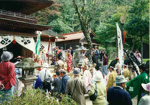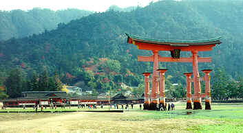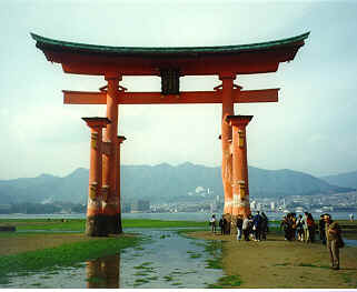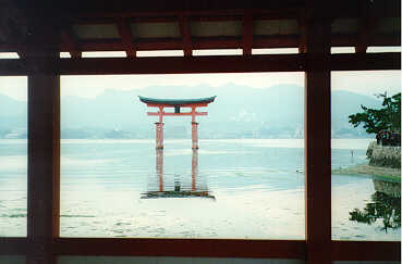 There is a white Buddhist temple barely visible through the Torii, on the mainland. (Veteran's Day, '97)