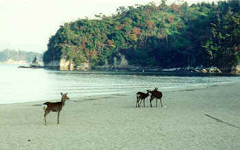 The sacred "god-deer" wander freely all over Miyajima Island, but it seemed odd to see deer lounging on the beach; they calmly walked away when they discovered we weren't planning to feed them! (Veteran's Day, '97)