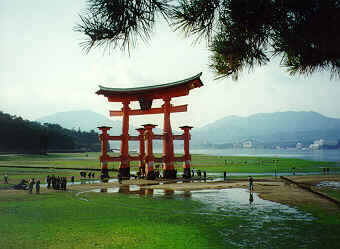 View shows the Torii from the seawall, as we approached the bay. The green stuff on the ground that looks like grass, isn't... it's a form of seaweed! Remember, that's low tide on a tidal flat :-) (Veteran's Day, '97)