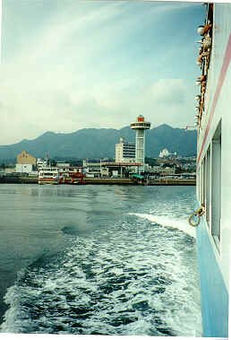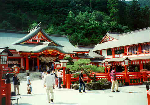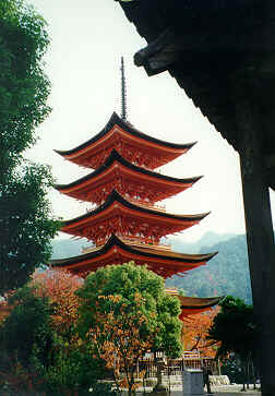 This sits on a hill beside the bay, overlooking the shrine and Torii. The dark wood building beside it, is also a Buddhist building, a library I believe. (Veteran's Day, '97)